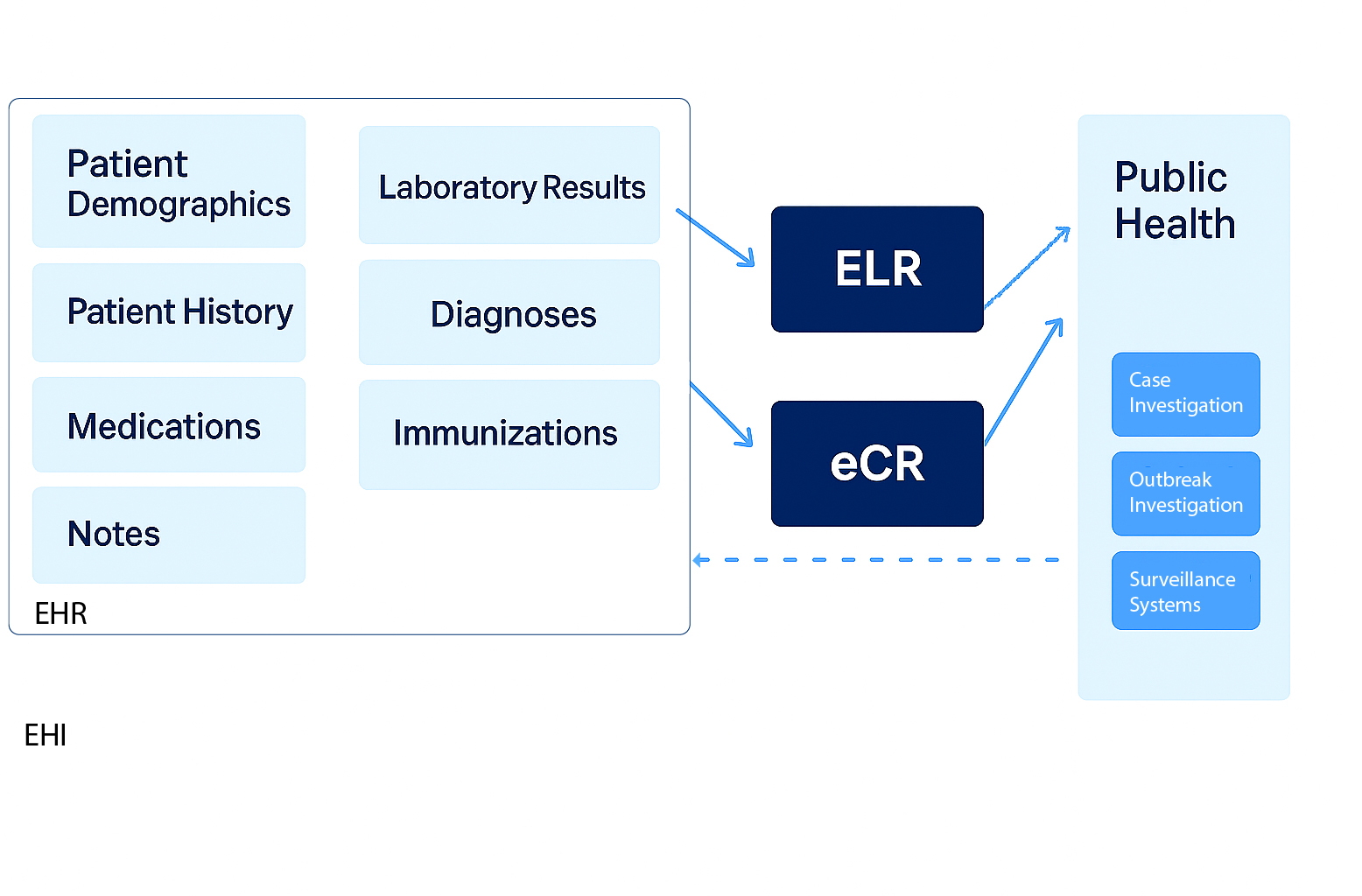 Alt text: Diagram showing how EHI relates to EHR data such as demographics, history, medications, notes, labs, diagnoses, and immunizations flow through ELR and eCR to public health for case investigation, outbreak investigation, and surveillance systems.