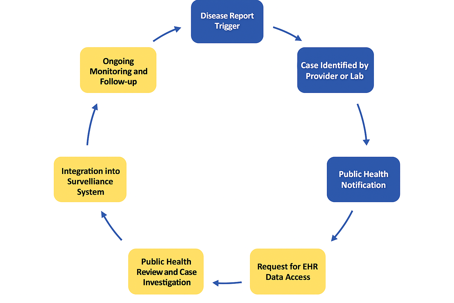 Alt text: A circular flowchart showing the disease reporting process with the following steps in order: Disease Report Trigger, Case Identified by Provider or Lab, Public Health Notification, Request for EHR Data Access, Public Health Review and Case Investigation, Integration into Surveillance System, and Ongoing Monitoring and Follow-up.